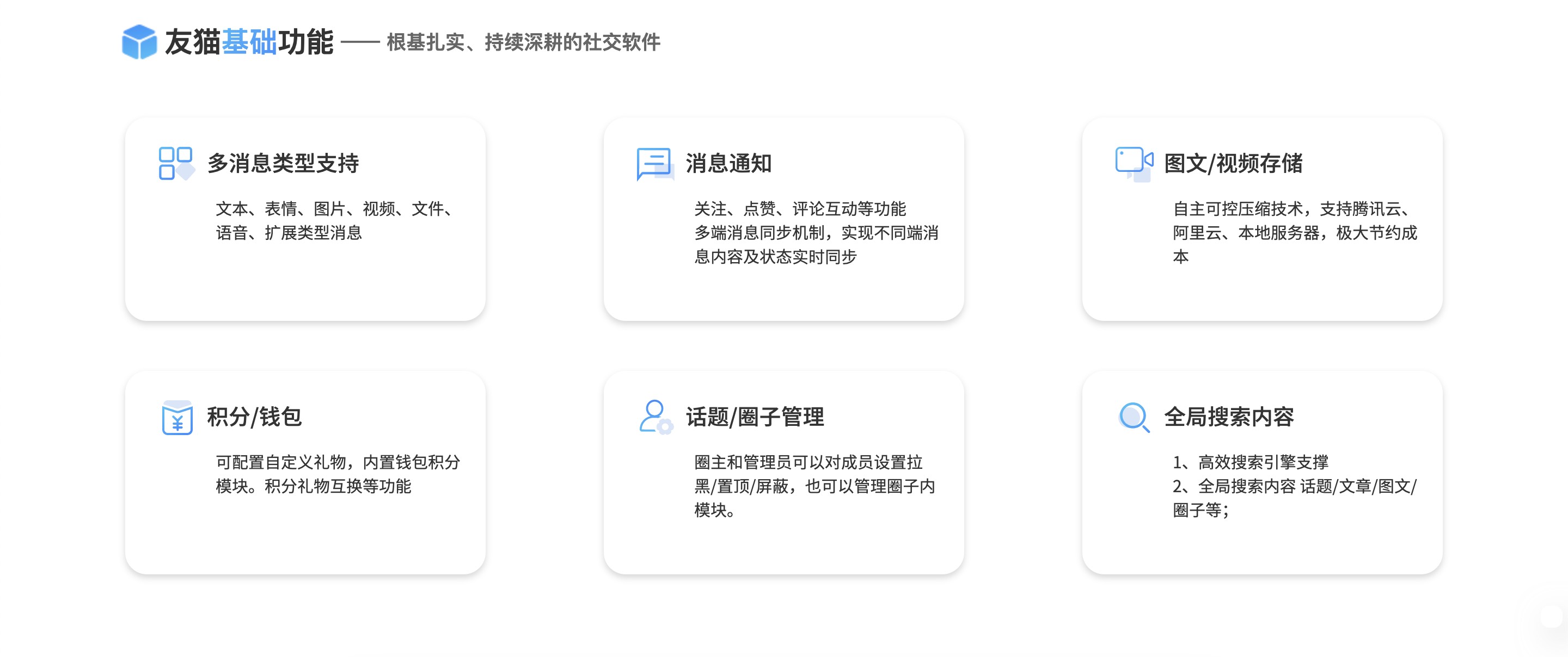 友猫社区系统:原生支持图文/短视频/长文章发布、圈子/话题管理、问答悬赏、积分钱包、VIP会员、AI智能评论、内嵌商城等功能,相当于自带商业变现能力的专属论坛。