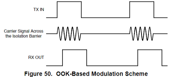 采用 OOK(开关键控)调制,480MHz 载波跨隔离层传输,对称设计提升 CMTI、降低辐射。