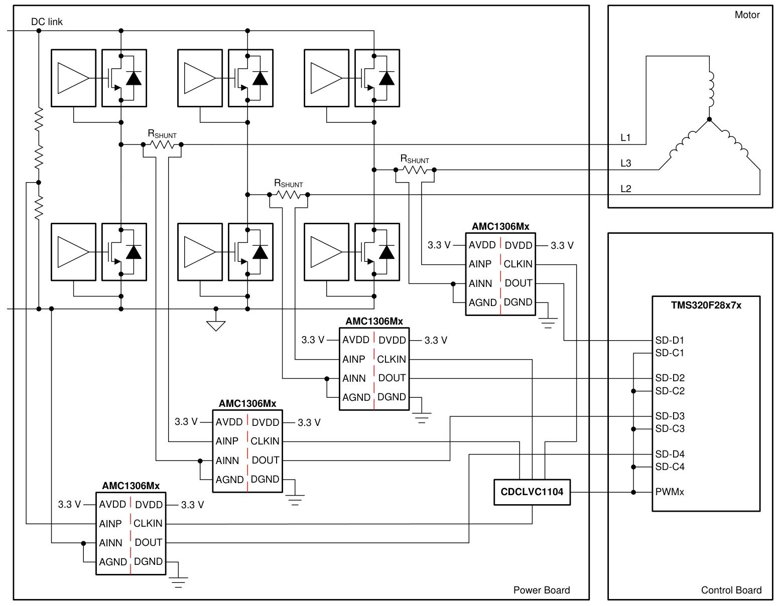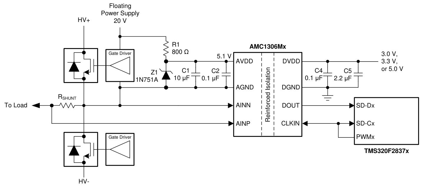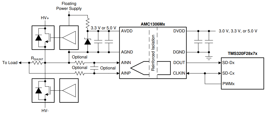 TMS320F2807x 和 TMS320F2837x 提供了适配的可编程硬件滤波器结构,称为Σ-Δ 滤波器模块(SDFM),专为与 AMC1306 系列配合使用优化。