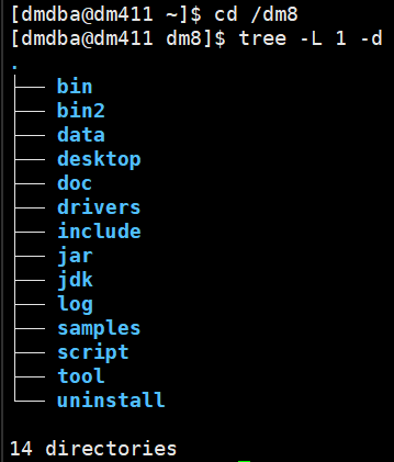 使用 tree -L 1 -d 查看 dmdbms/ 安装目录: