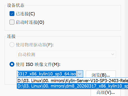 将 DM8 的 ISO 镜像文件挂载到虚拟机光驱(VMware 设置"已连接"并且选择 ISO 文件),然后使用 root 用户执行: