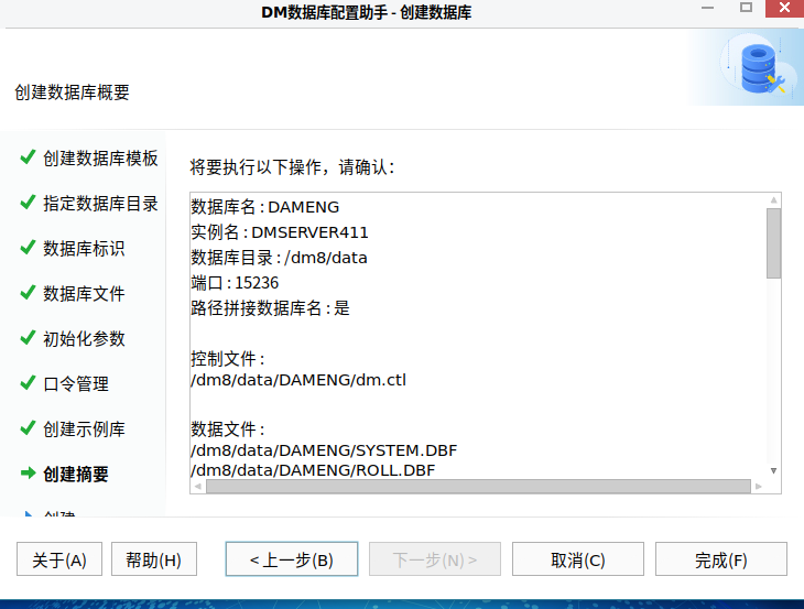 执行后,终端会打印出初始化日志(显示各项参数的值,以及创建 SYSTEM.DBF、MAIN.DBF、ROLL.DBF 等物理文件的过程)。当看到 create dm.ini success. 等字样,即表示实例目录和文件初始化成功。