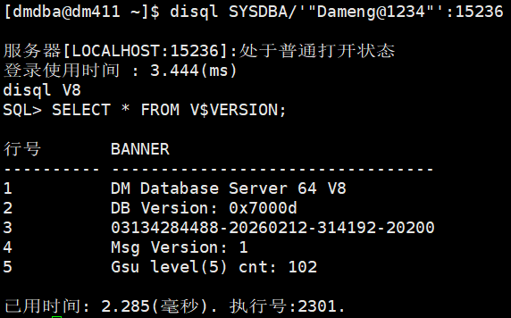 切换到 dmdba 用户,使用 disql 连接数据库: