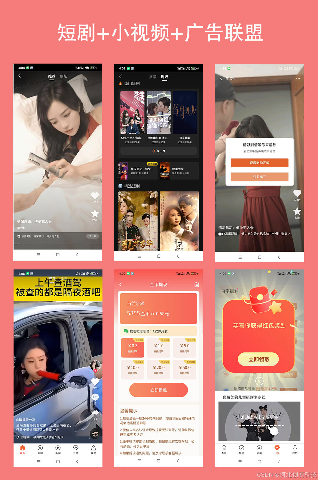 本产品是一款以免费短剧为核心流量入口,融合红包裂变、金币激励、广告变现的短视频短剧 APP,主打 "看短剧领红包、做任务赚金币、金币提现秒到账" 的用户体验,通过高激励玩法实现用户拉新、留存与商业变现,同时支持后续拓展直播、电商带货等增值功能。