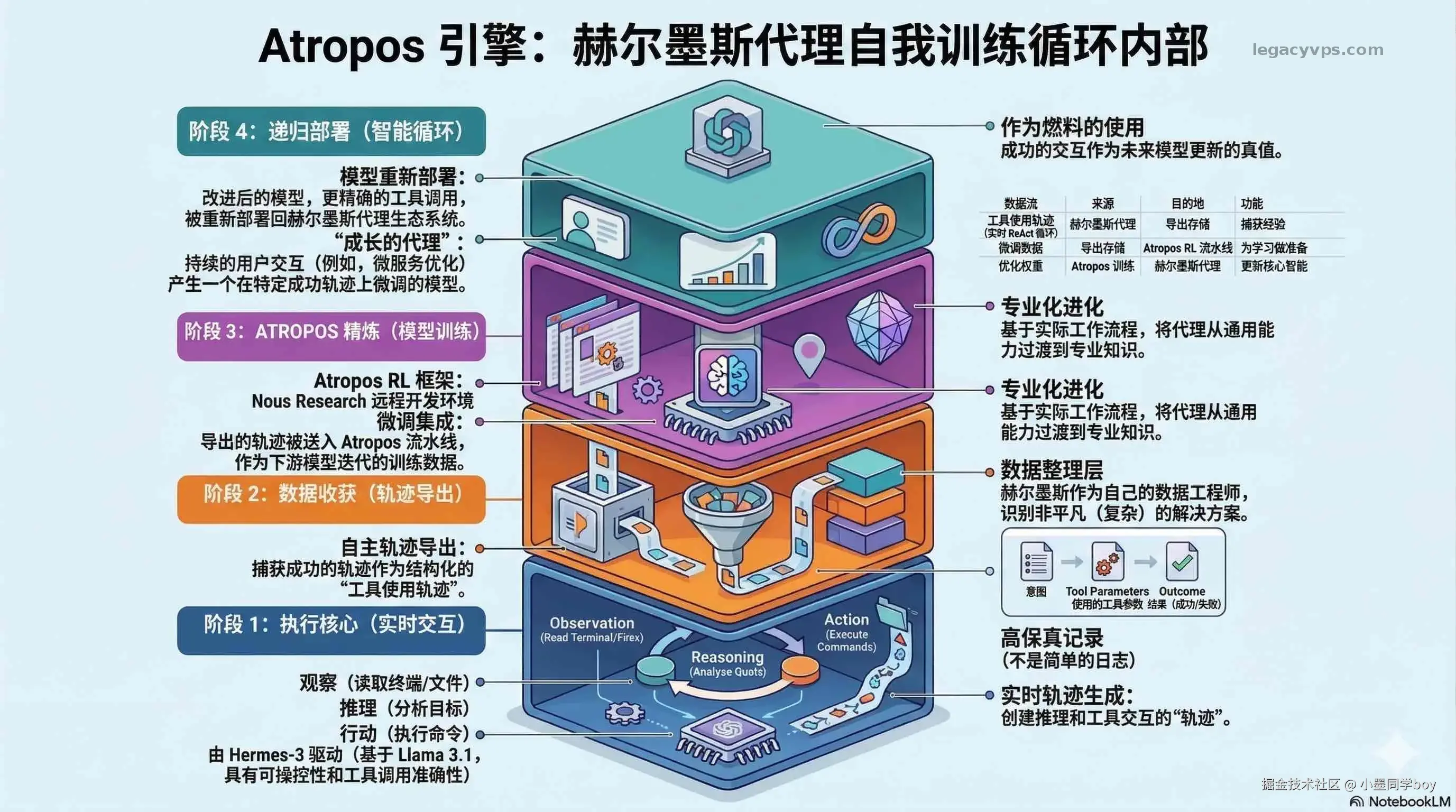ReAct 循环:观察(读终端输出或文件内容)→ 推理(对照目标分析当前状态)→ 行动(执行命令或调用工具)。驱动这个循环的是 Hermes-3 模型(基于 Llama 3.1),Nous Research 自家的 Atropos 做了专项微调,重点针对工具调用精度和多步规划------跑长任务不容易迷路。