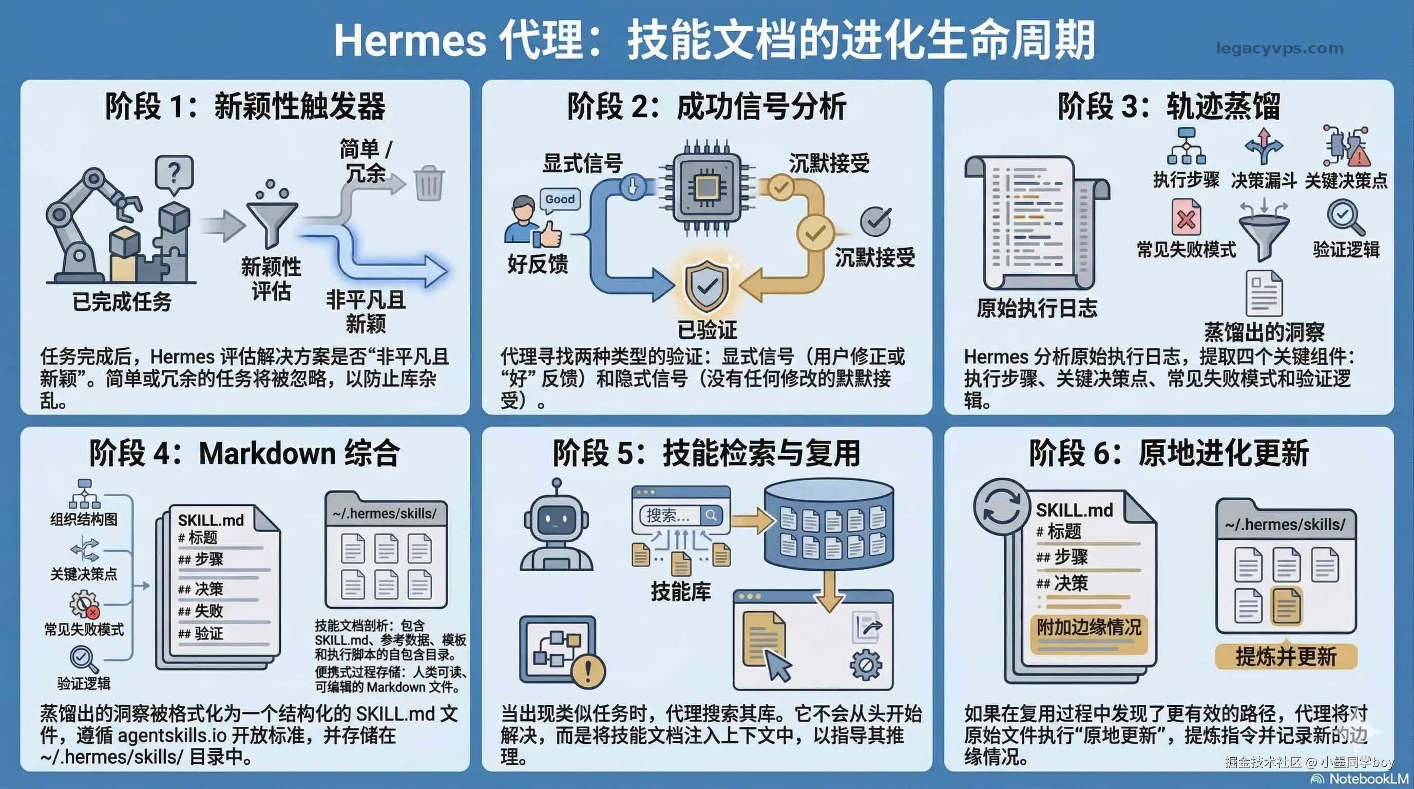提炼内容 :从执行轨迹里抽取:执行步骤、关键决策点、常见失败模式、验证逻辑,打包成一个有名字的 Markdown 文件(存在 ~/.hermes/skills/ 下)。文件格式遵循 agentskills.io 开放标准,可以装别人沉淀好的技能,也可以把自己的共享出去。