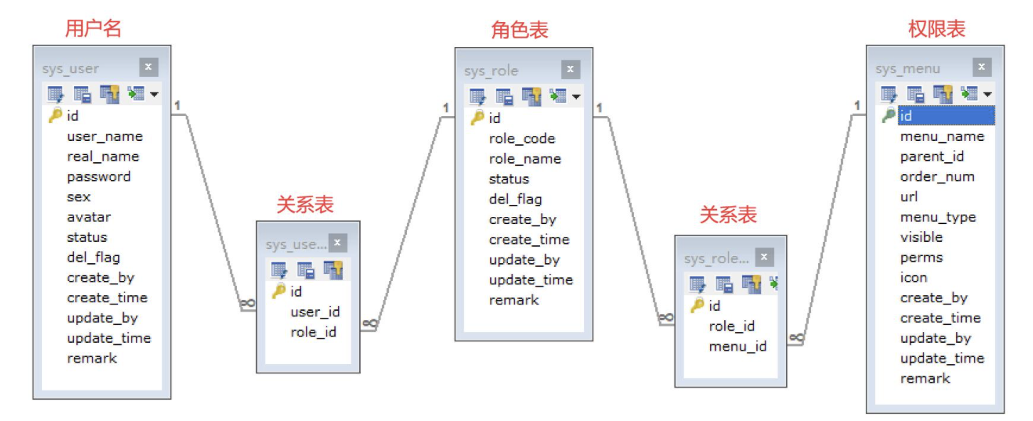 - 用户和角色:多对多一个用户能有多个角色,一个角色也能对应多个用户。