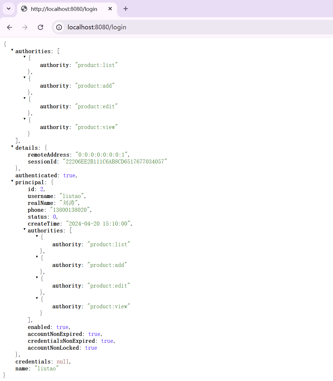 认证成功后,可以看到 liutao 当前用户的权限 有 增改查 权限操作,没有删除权限。