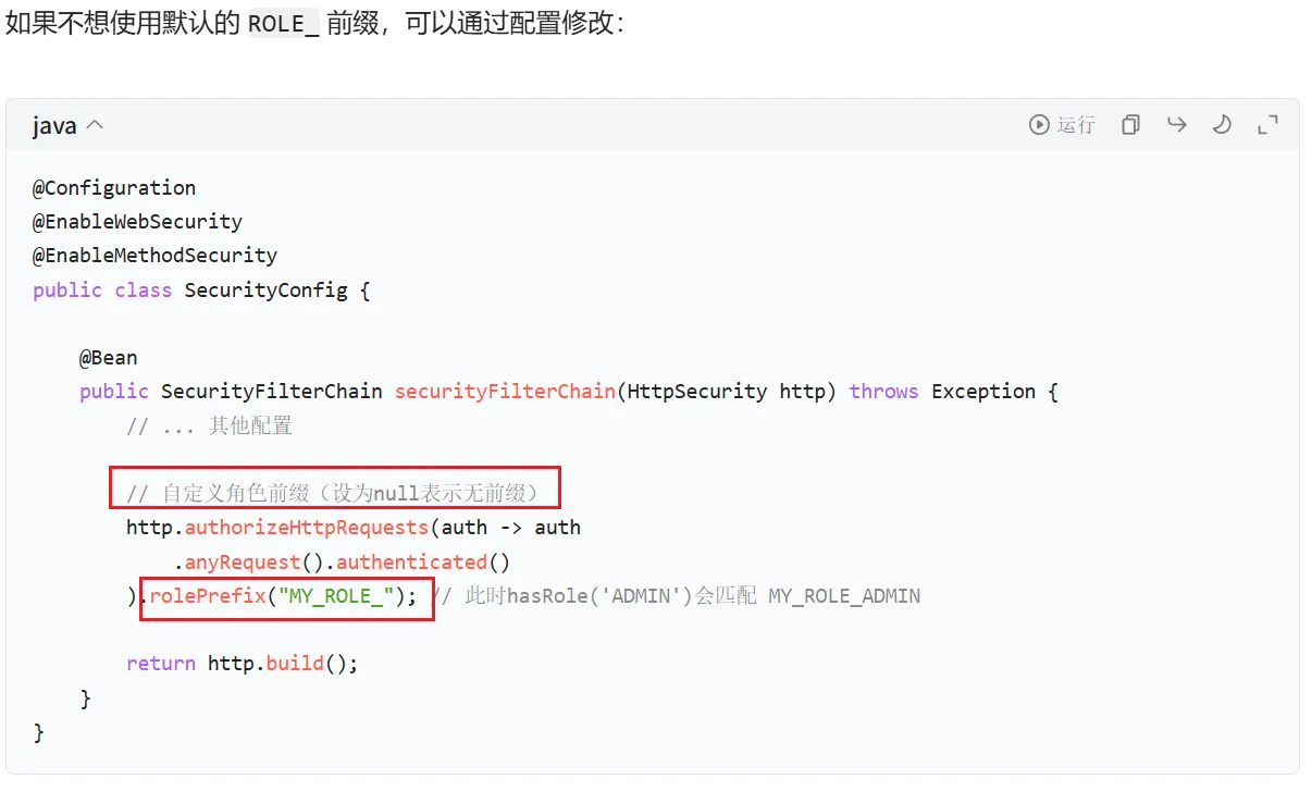 Spring Security 会自动为角色名添加前缀****ROLE_ (默认配置),因此实际校验的权限是ROLE_角色名。
