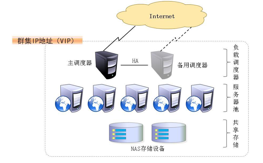这是访问整个群集系统的唯一入口 对外使用所有服务器共有的 VIP(Virtual IP 虚拟 IP)地址 也称为群集 IP 地址 通常会配置主 备两台调度器实现热备份 当主调度器失效以后能够平滑替换至备用调度器 确保高可用性