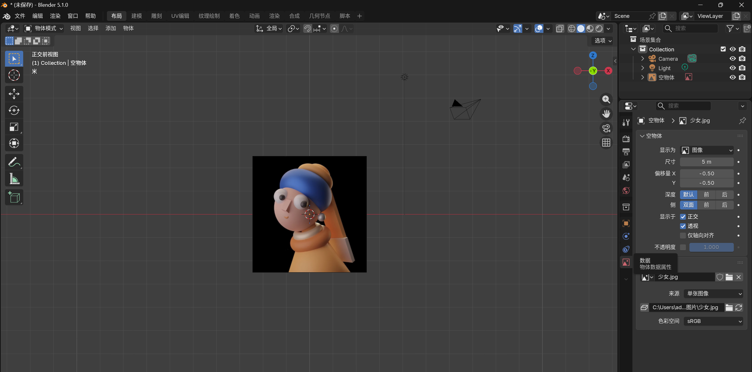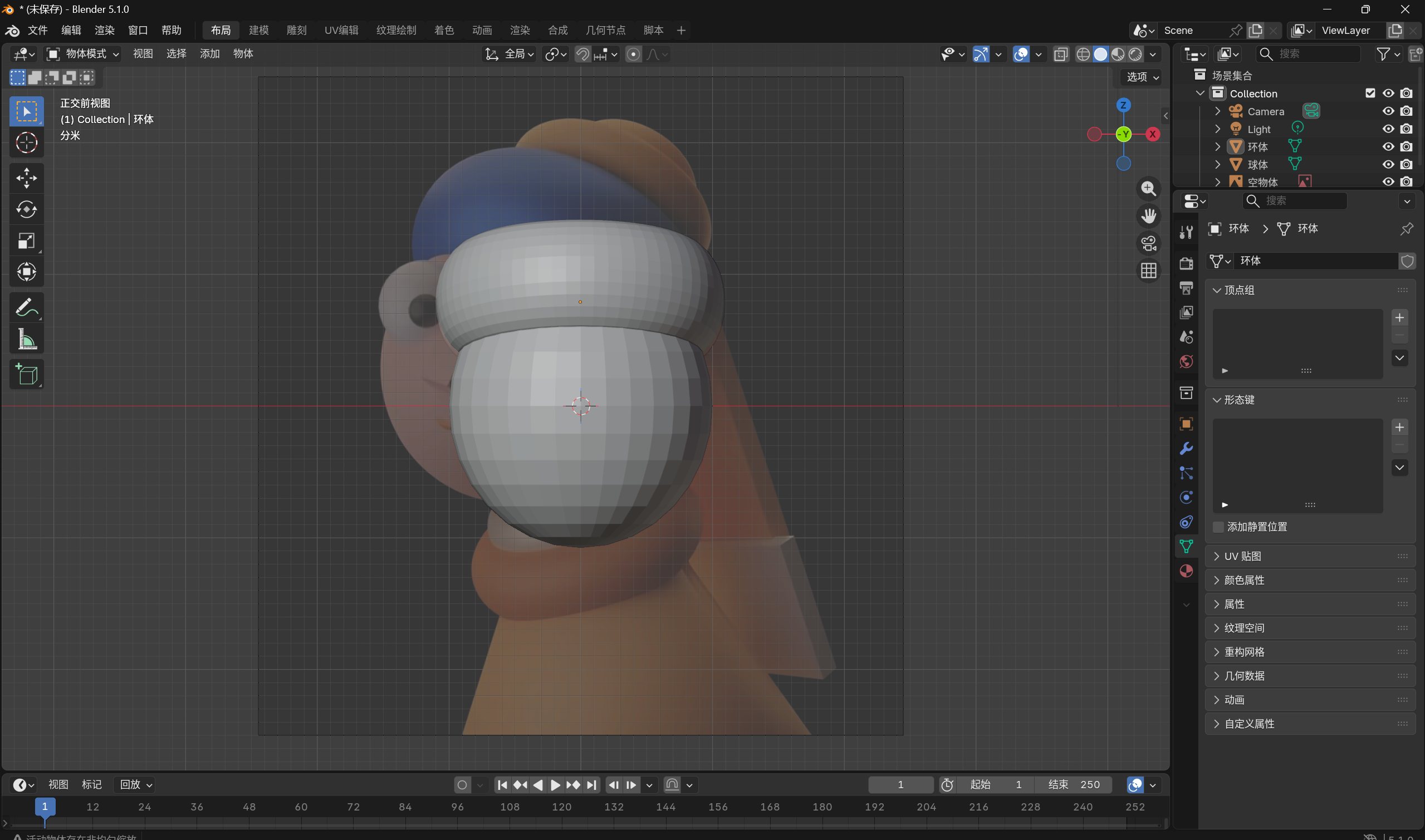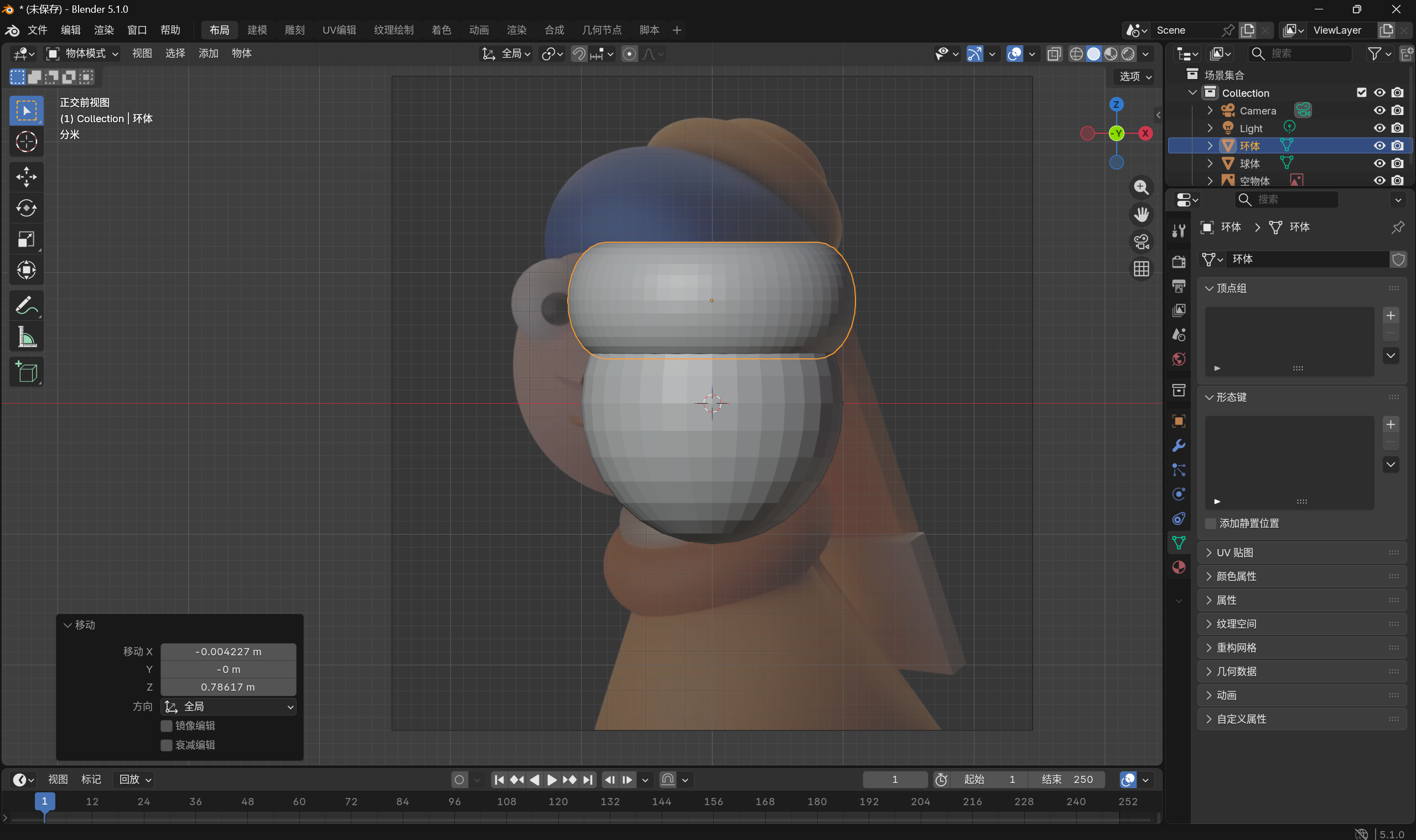 我们用这个环体去当作这个珍珠耳环的少女的头巾(这时候我们需要切换不同的视图来对这个头巾的摆放位置进行调整以便于我们正视图看到的结果不出差错):