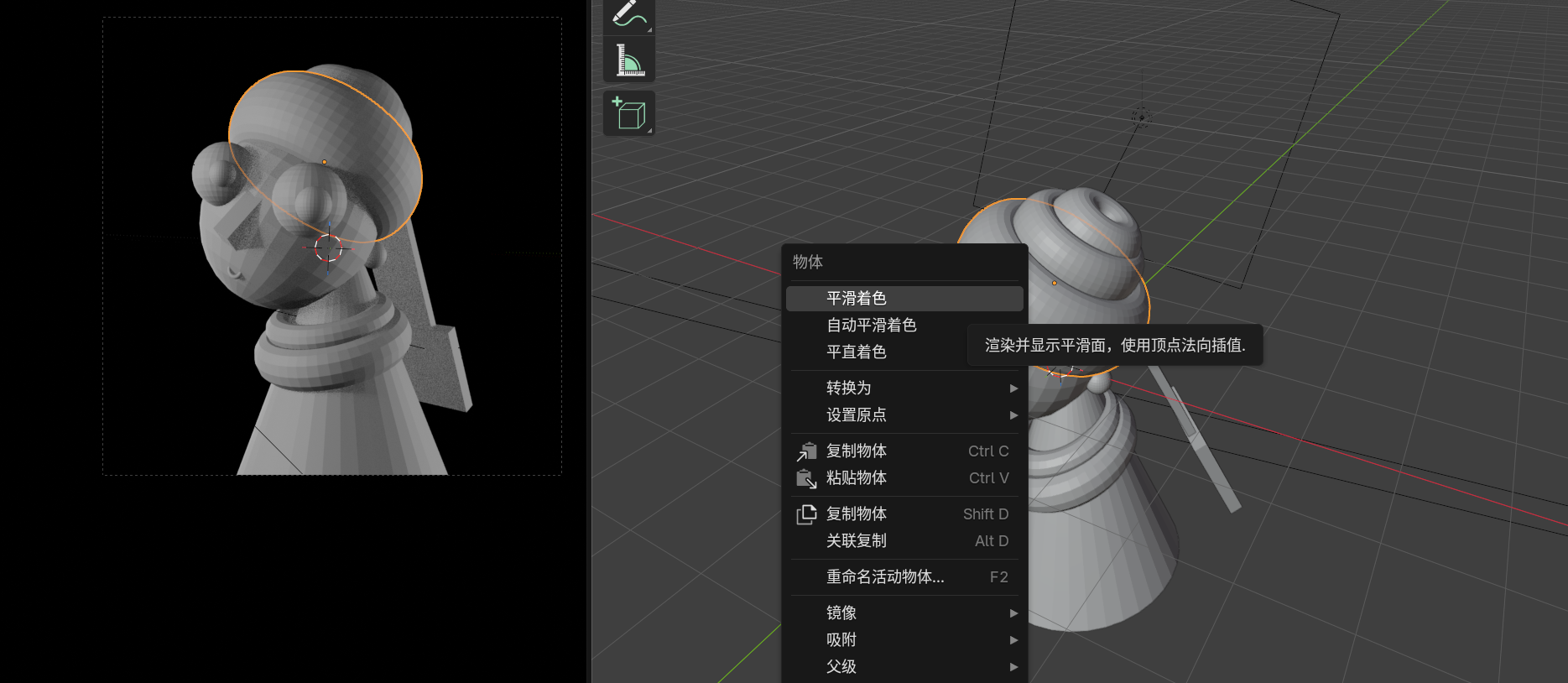 这时候我们应该还会觉得这个模型一点都不光滑,我们选中物体再按鼠标右键,点击平滑着色即可(可以框选整个物体然后一起平滑着色)