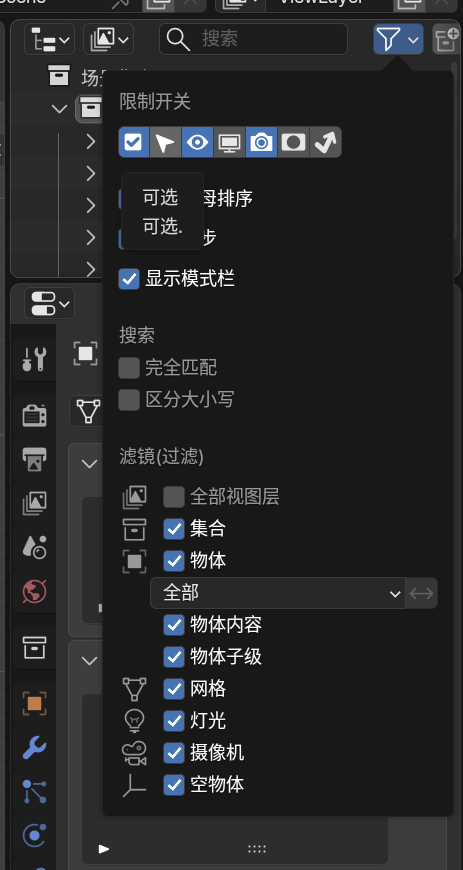 现在我们离打败这个新手boss就差一步了就是上材质,上材质前我们先来学一下给场景集合中的物体分个类,右上角我们就一个集合但是里面堆满了灯光、摄影、物体,非常杂乱,这时候我们就需要再开一个集合给他们分开放: