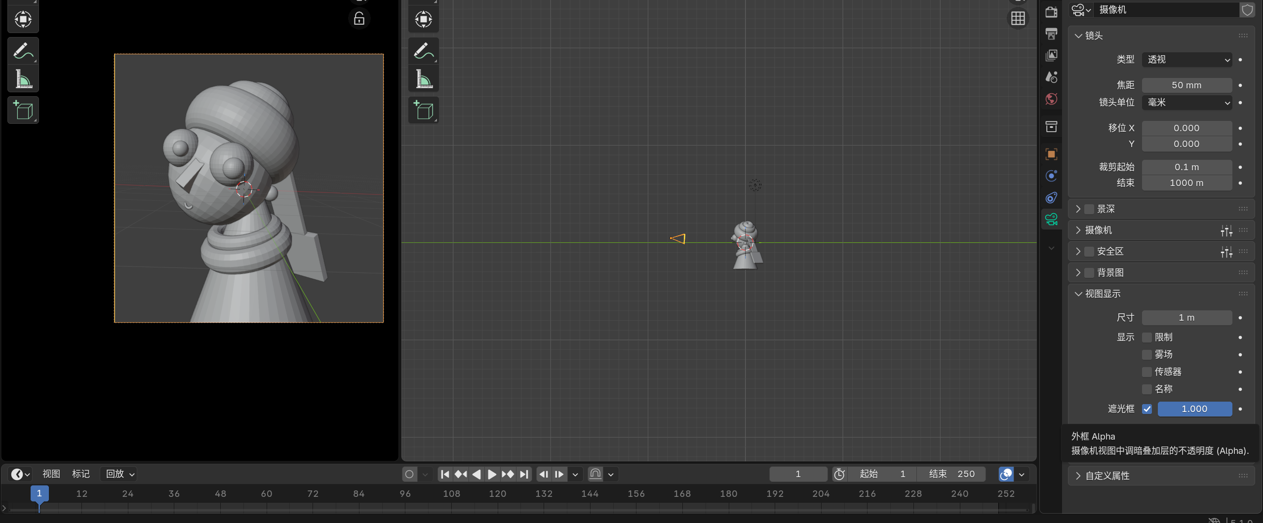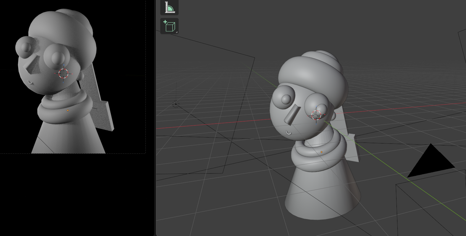 我们这样其实也可以做出我们想要的画面但是操作起来说实话不是很方便,而且新手可能对Blender界面熟悉程度也没有那么高,所以使用起来就会很麻烦,下面我们来说一下比较快捷的方法,我们首先拉出来一个窗口(左边窗口我们按快捷键0进行摄像机视图),我们选择左边的窗口然后按下快捷键N,切换视图一栏,给锁定一栏的摄像机到视图方位给勾选上,这时候我们去摇动左边的视角就不会退出摄像机模型,大家就可以直接调整至自己满意的摄像机视图了: