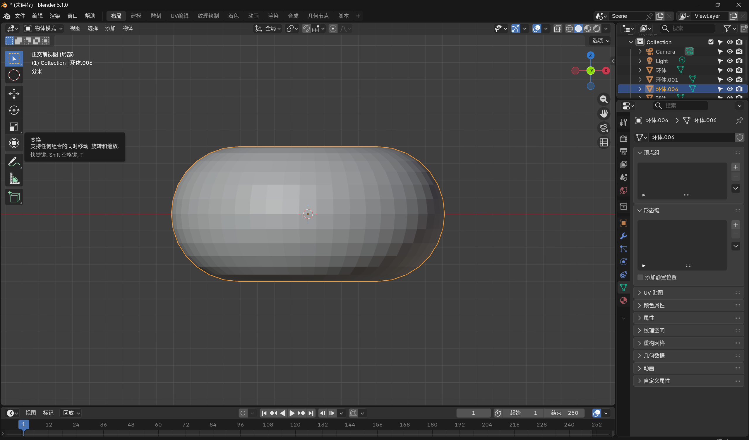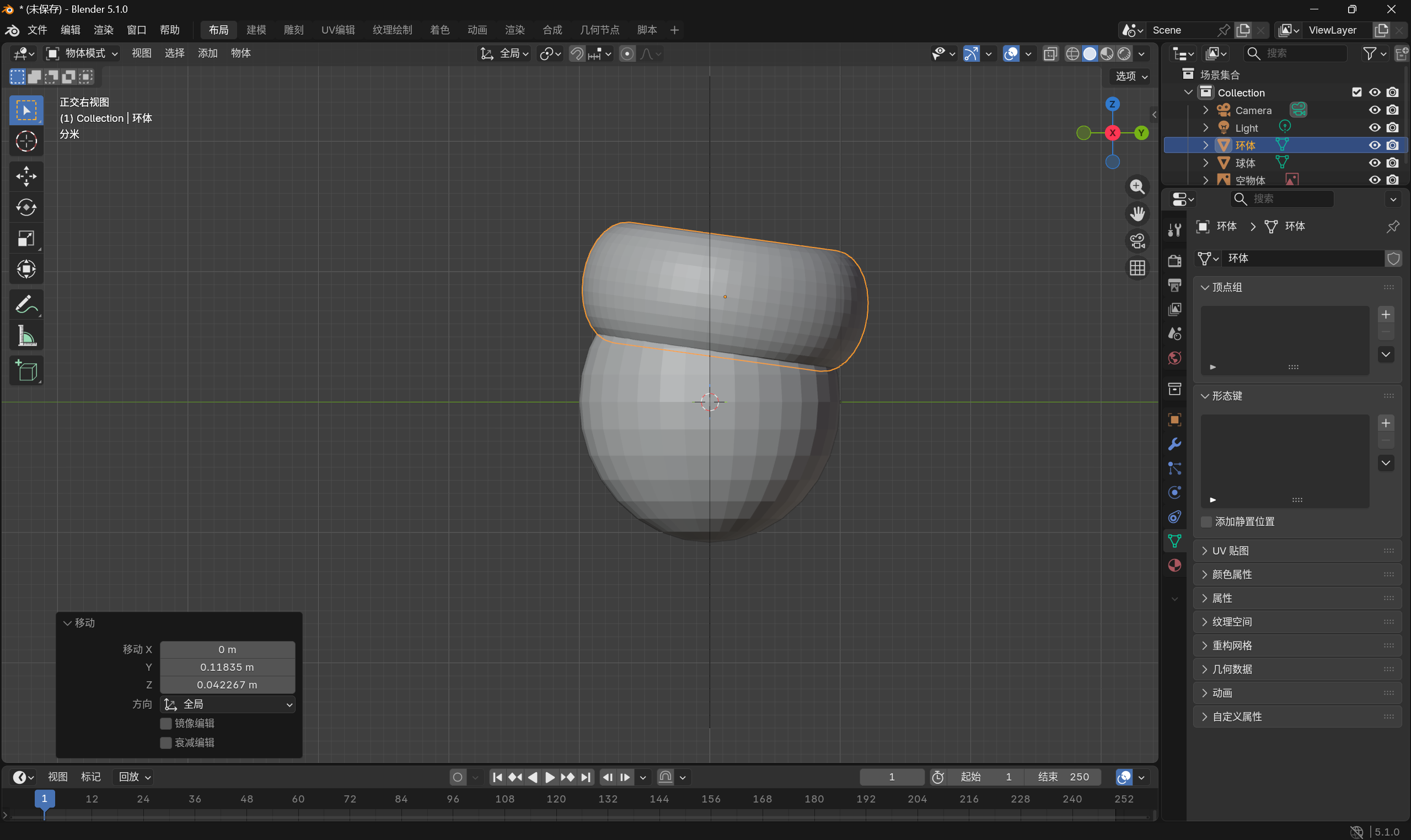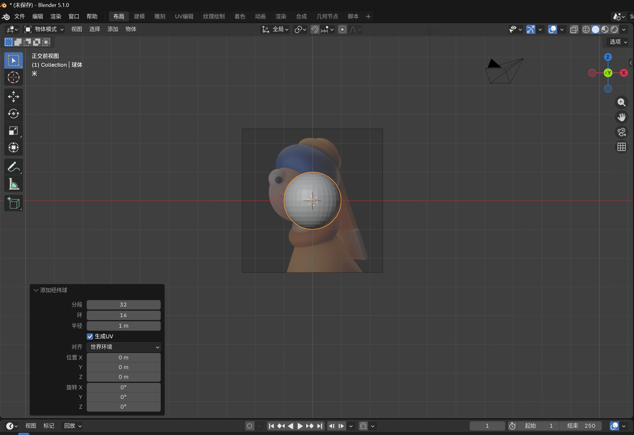 左下角是有一个小窗口的,这个窗口可以方便我们对初始化的一个经纬球进行细致的操作,更改分段数,环,半径等等因素(这里要注意每个新建的模型只可以进行一次更改默认的参数),下面操作其实就很简单了,就是去不停的建模然后改参数,我们下面再去建立一个环体作为他的头巾:
