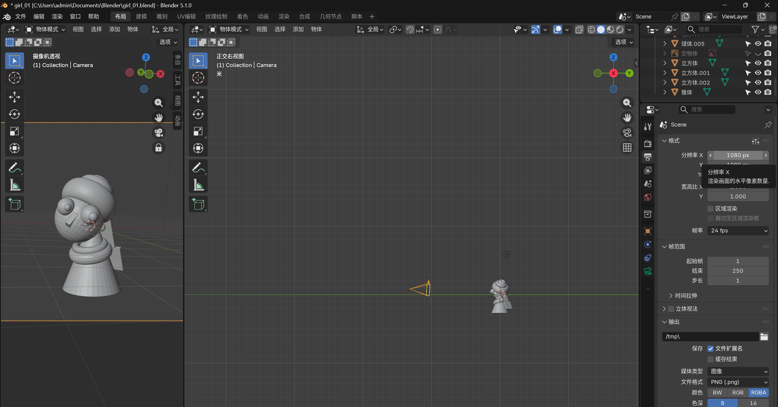 我们首先找到左边的分辨率x改成1080,这样左边的摄像机视图就是一个正方形,大家也可以给输出的文件夹放到自己想要的地方