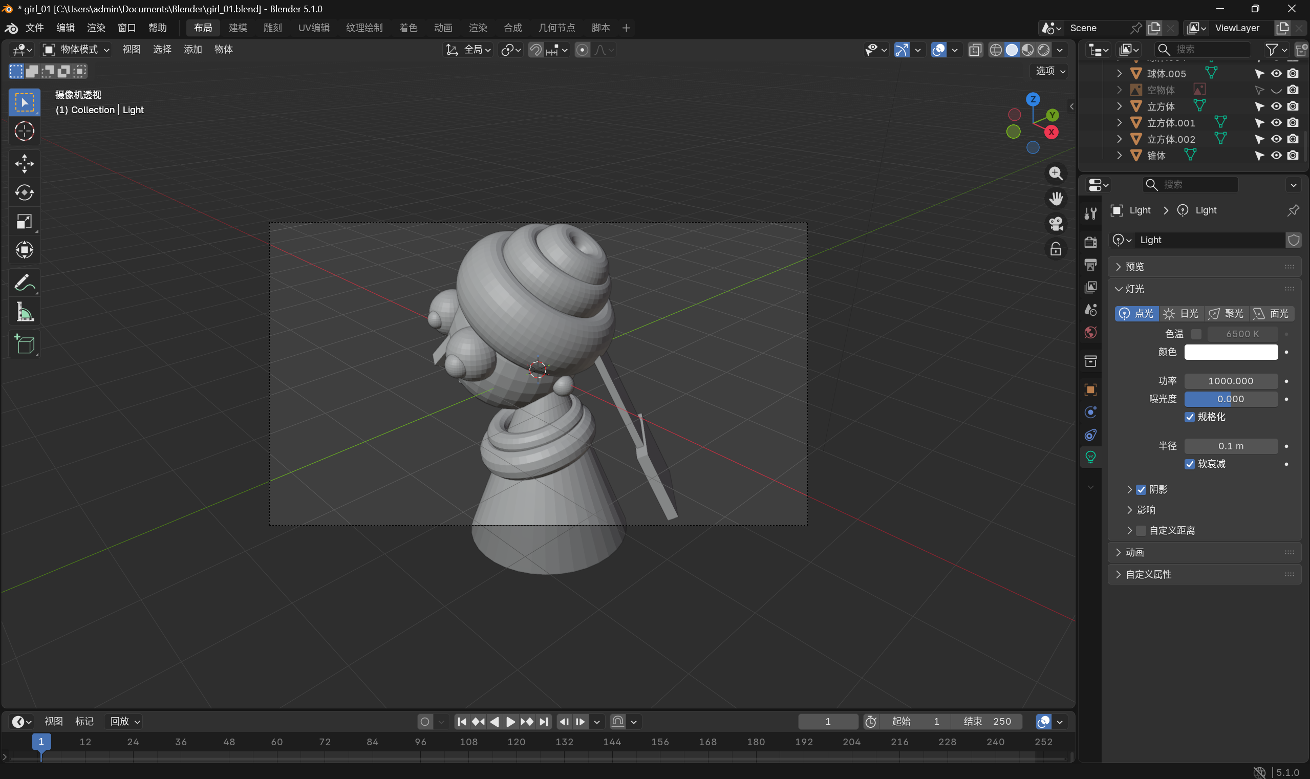 下面我们来看布光,Blender初始就给了我们一个灯光: