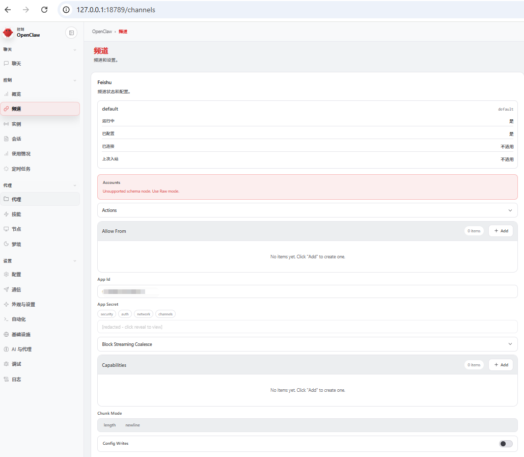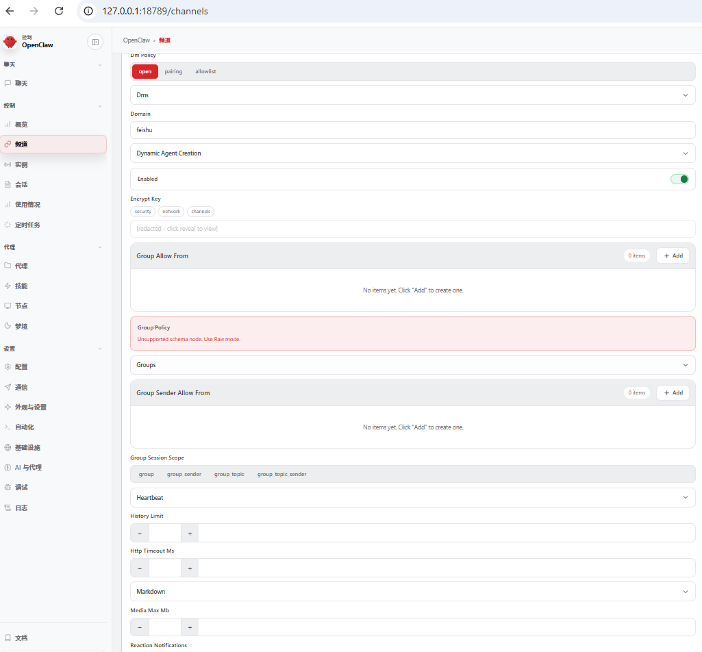 7、调试,飞书一直没有反应,参考下我的配置,我就是DM策略没有更改,导致无法配对,目前选择开放。不是很专业这一步很重要,选open和所有就对了。