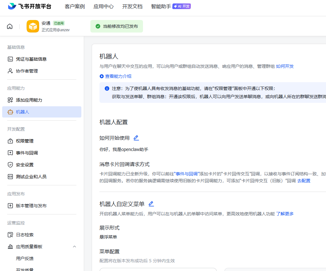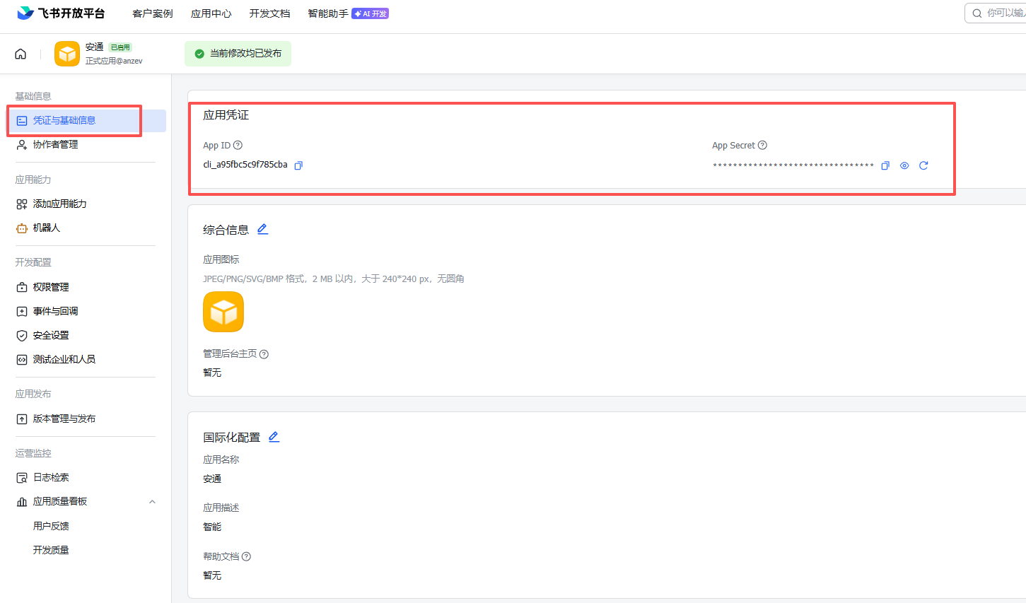 然后发布版本,记录凭证信息,龙虾安泽飞书的时候用得到