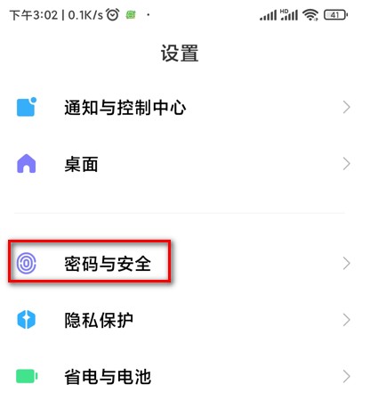 - 点击手机设置按钮,在设置界面,点击密码与安全,如图 10 所示。