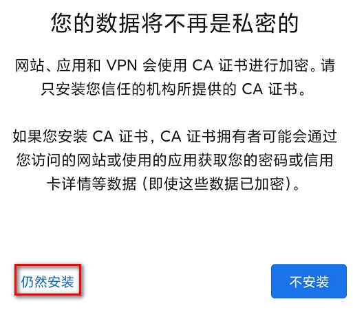 - 手机会提示警告信息:您的数据将不再是私密的,点击下方仍然安装,如图 14 所示。