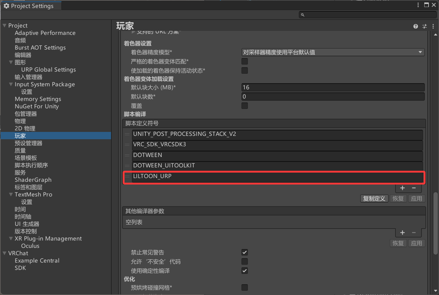 1、打开编辑-项目设置-玩家中的脚本定义符号,添加一条LILTOON_URP后点击应用。