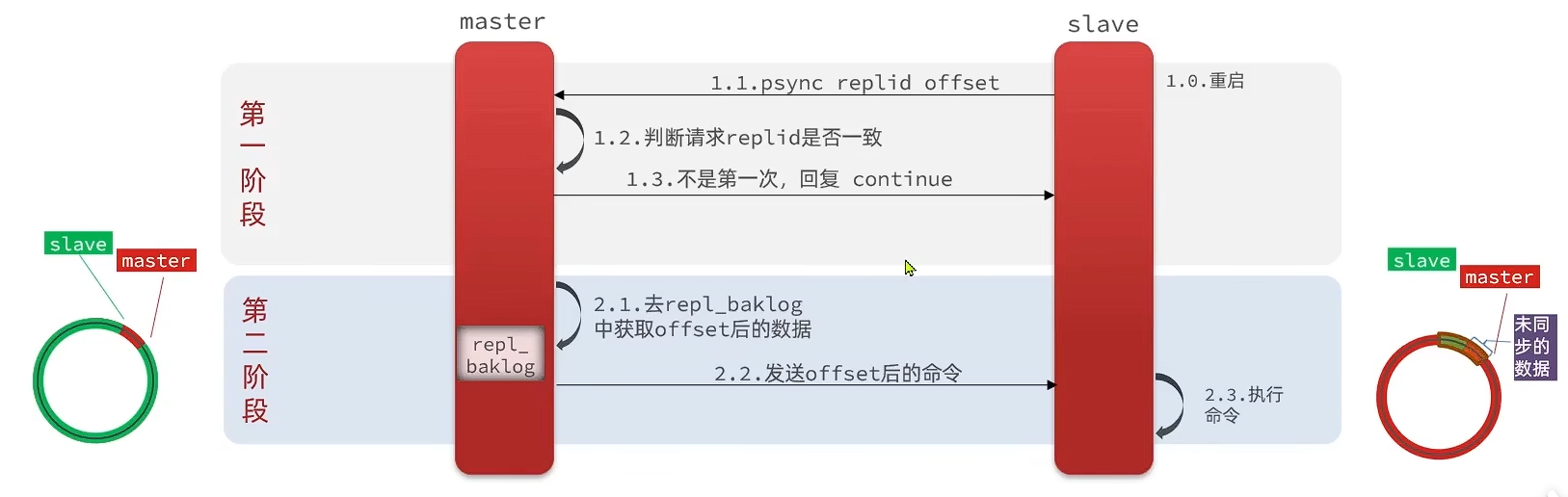 Replication Id:简称replid,是数据集的标记,Id一致则说明是用一个数据集,每一个master都有唯一的replid,slave则会继承master的replidoffset:偏移量,随着记录在repl_baklog这个数据增多而增大,slave完成同步时也会记录当前同步的offset。如果slave的offset小于master的offset,说明slave数据落后于master,需要更新因此slave做数据同步,必须向master声明自己的replid和offset,master才可以判断需要同步哪些数据