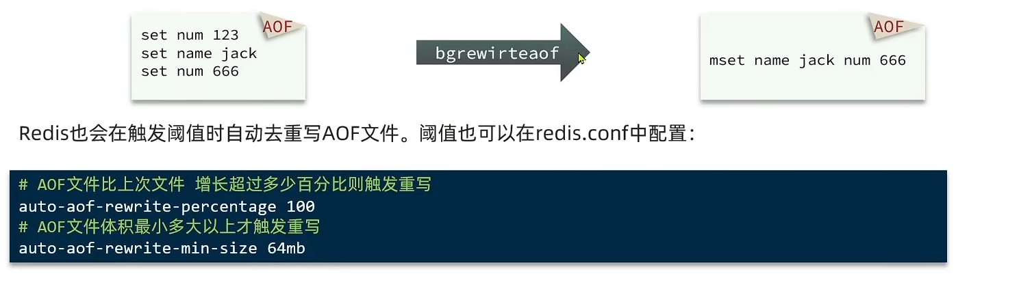因为是记录命令,AOF文件会比RDB文件大的多,而且AOF会记录对同一个key的多次写操作,但只有最后一次写操作才有意义。通过执行bgrewriteaof命令,可以让文件执行重写功能,用最少的命令达到相同的效果