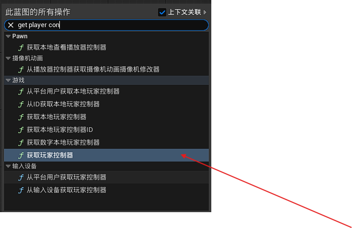 首先我们点击右键输入"Get player controller"找到"获取玩家控制器这个函数"
