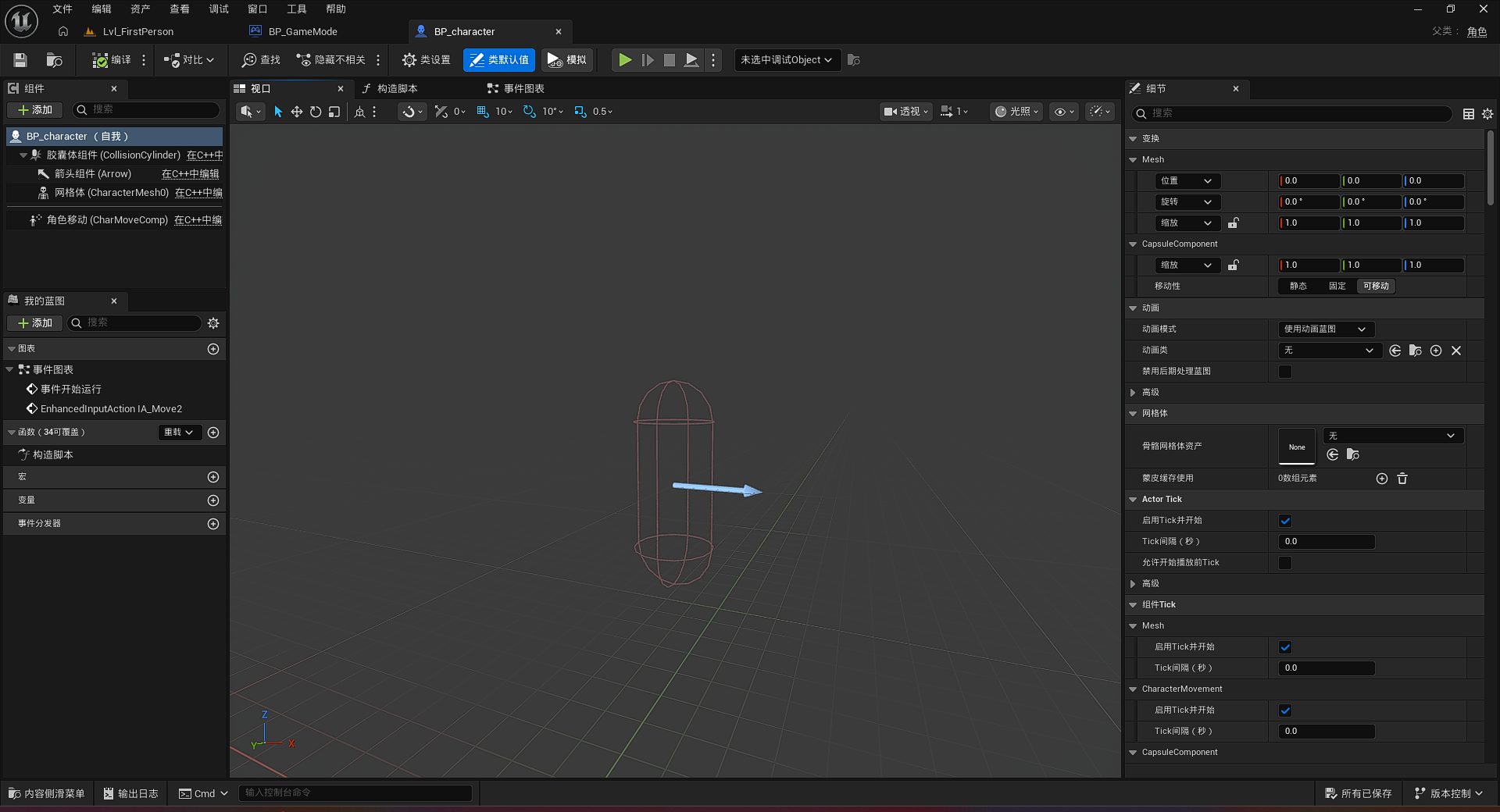 此时我们打开刚创建好的角色,胶囊状的是人物的碰撞体积