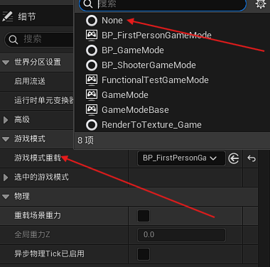 如果还能移动,我们先打开编辑->项目设置->游戏与模式->默认游戏模式,游戏1模式此时被设置为"FirstPersonGameMode"