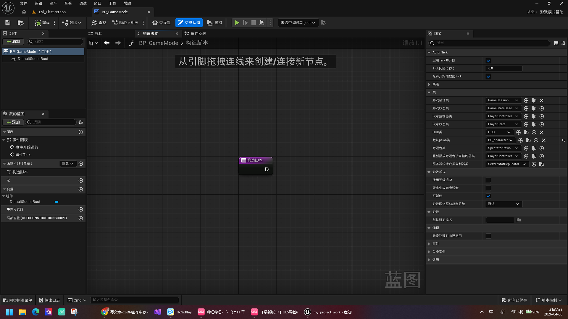此时我们回到GameMode,我们将默认pawn类设置为我们刚才创建的角色