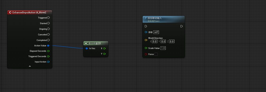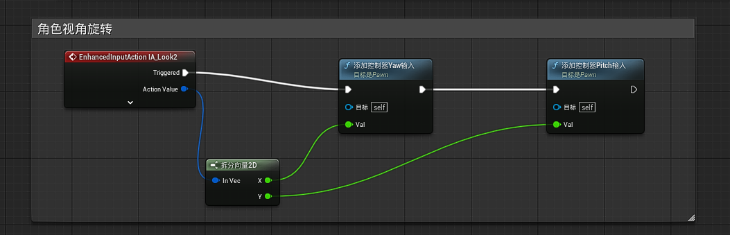 之后找到"Action Value"长按节点拖出,此时在绘制那栏选择"拆分向量2D",并将其"X"连到"yam",将"Y"连到"pitch"