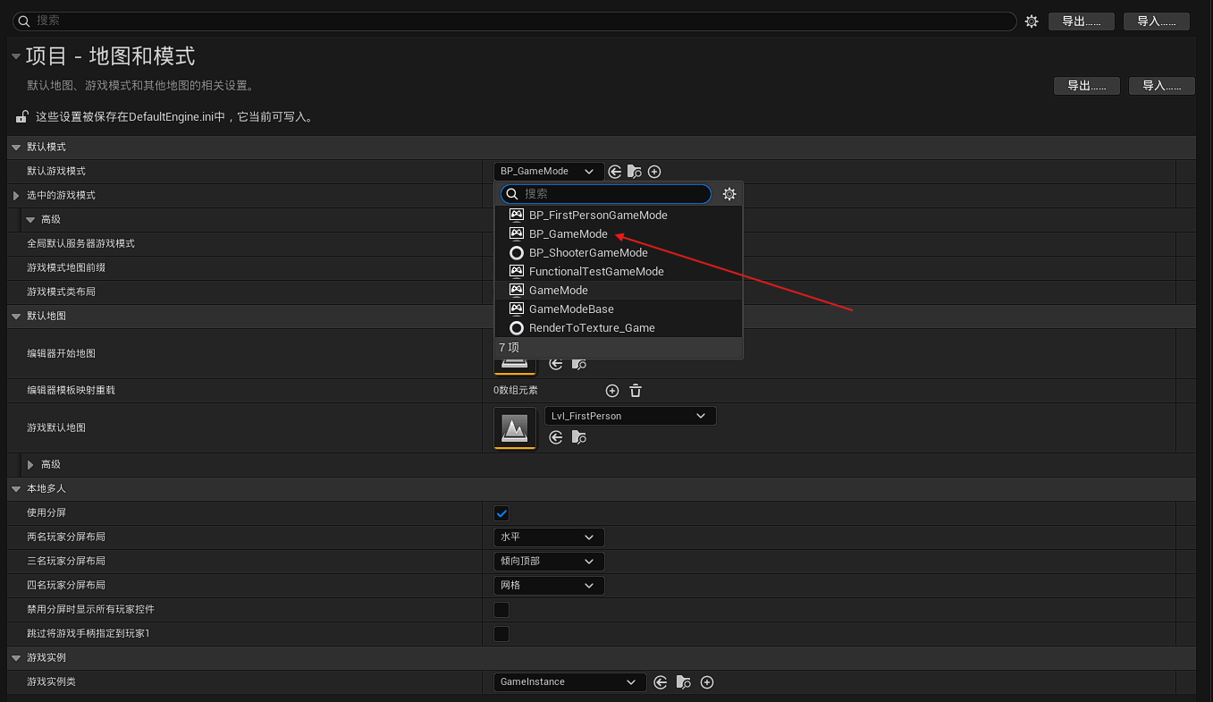 之后需要将游戏模式和场景进行关联,打开编辑->项目设置->默认游戏模式->将其改成创建好的模式