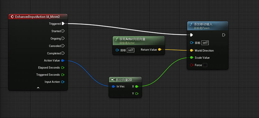 接下来点击右键,输入"get actor forward",点击取得actor向前向量并将其连上"World Direction"并将"scale value"和拆分向量2D的"x"节点连起来