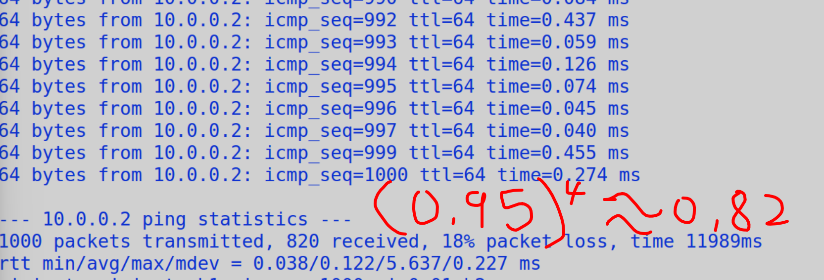 1000 packets transmitted, 820 received, 18% packet loss, time 11989ms