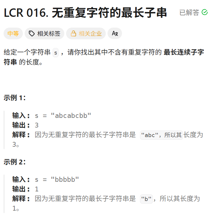 题意 :给定字符串 s,找其中不含重复字符的最长子串的长度。