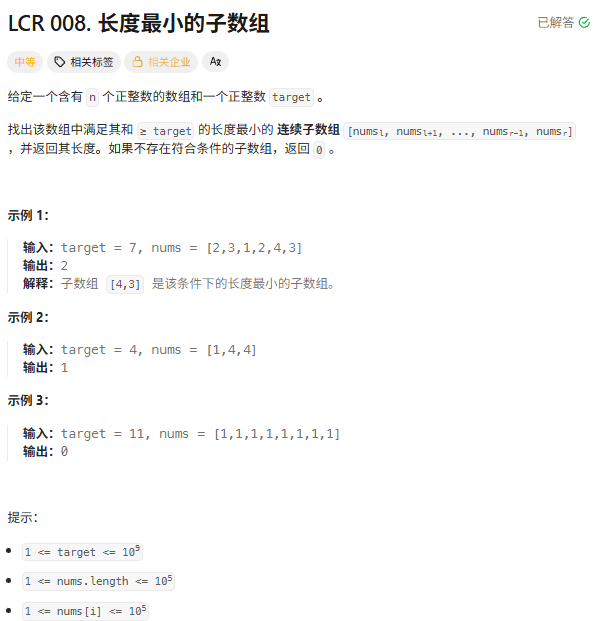 题意 :给定正整数数组 nums 和目标值 target,找长度最小的连续子数组,使其元素之和 ≥ target,返回其长度,不存在则返回 0。