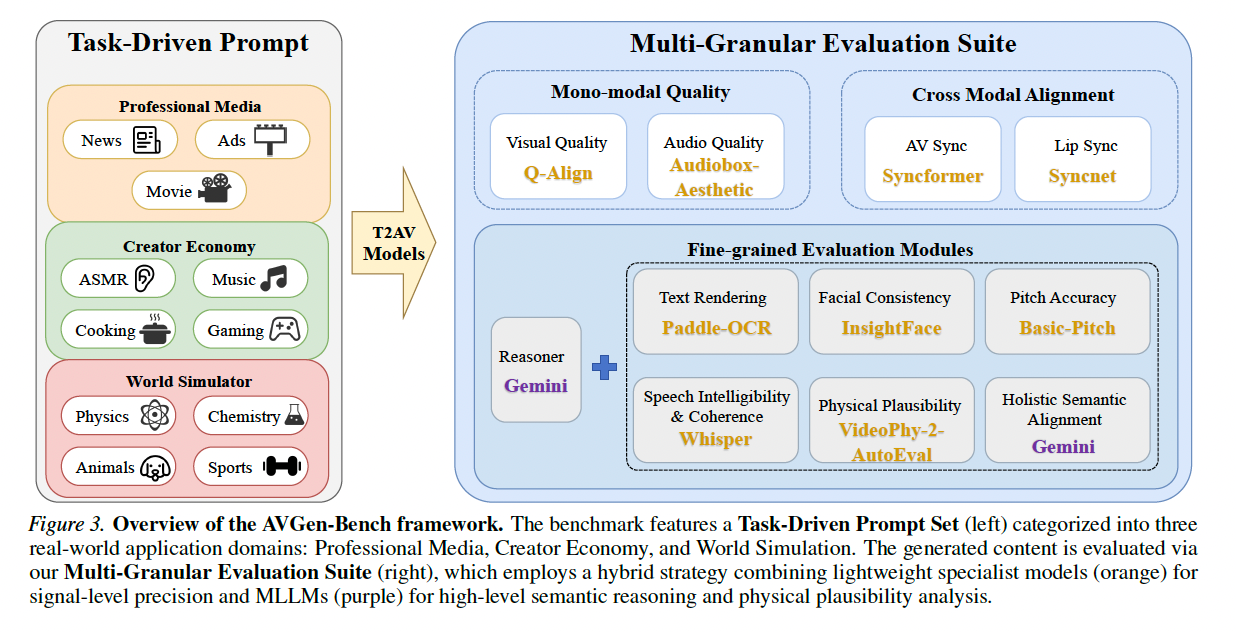 为了解决上述挑战,论文提出了AVGen-Bench,其核心并非一个单一的算法模型,而是一个 "任务驱动的基准数据集 + 多粒度混合评估框架"。该框架本身是一个复杂的算法系统,用于对T2AV模型进行自动化、多维度的量化评估。