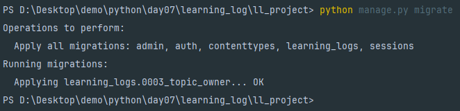 为了将所有既有主题都关联到管理用户 ll_admin,输入用户 ID 值1。这里可以使用已创建的任意用户的 ID,并非必须是超级用户。接下来,Django 使用这个值来迁移数据库,并生成了迁移文件