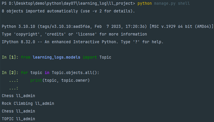 接下来,遍历用户列表并打印每个用户的用户名和 ID。当Django 询问要将既有主题关联到哪个用户时,我们将指定其中一个 ID值。