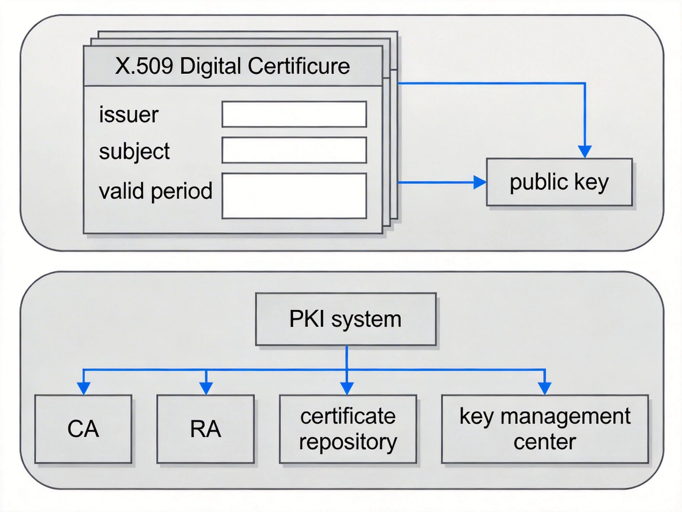 公钥基础设施(PKI)是完整的证书管理体系,核心组件包括: