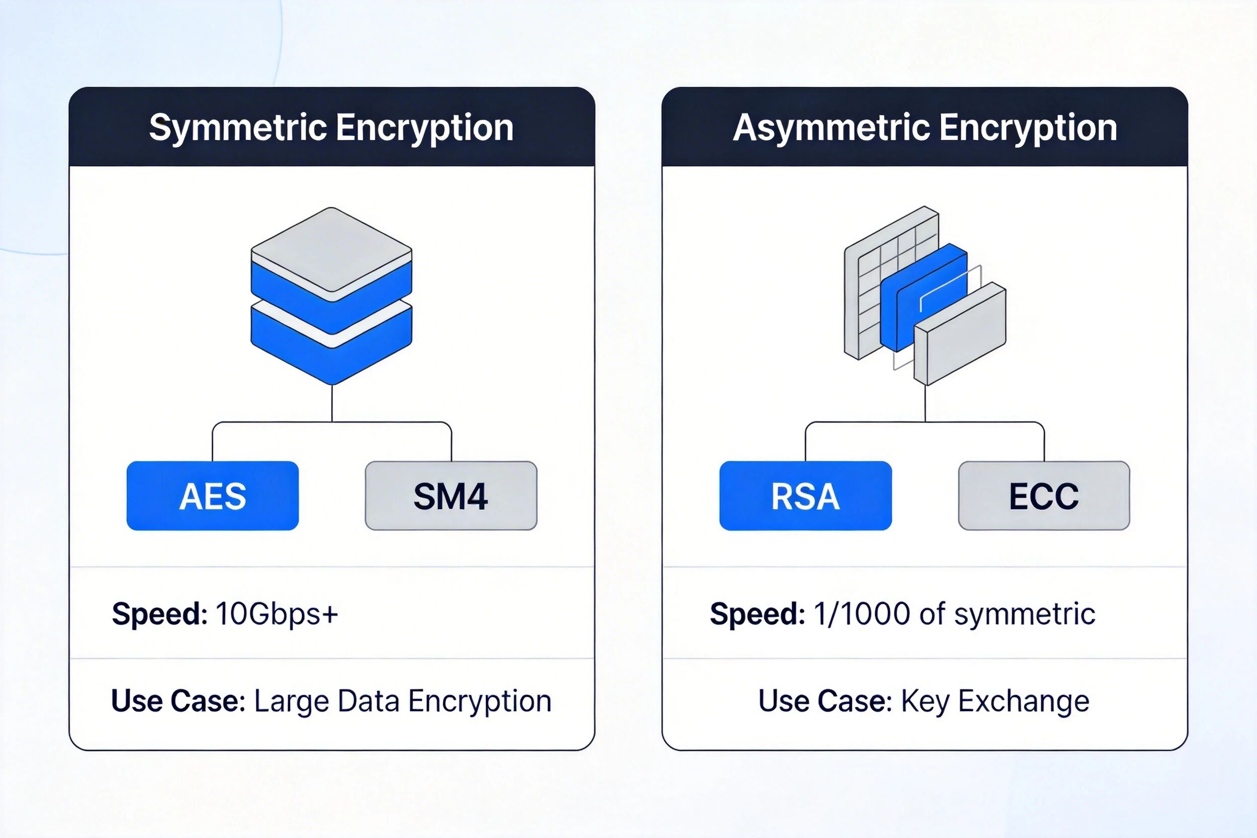 | 典型算法 | DES、3DES、AES、SM4、RC4 | RSA、ECC、SM2、Diffie-Hellman |
