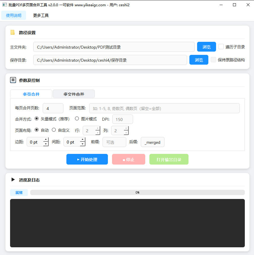 【批量PDF多页面合并工具】用于批量处理 PDF 文件,提供两种常用模式: