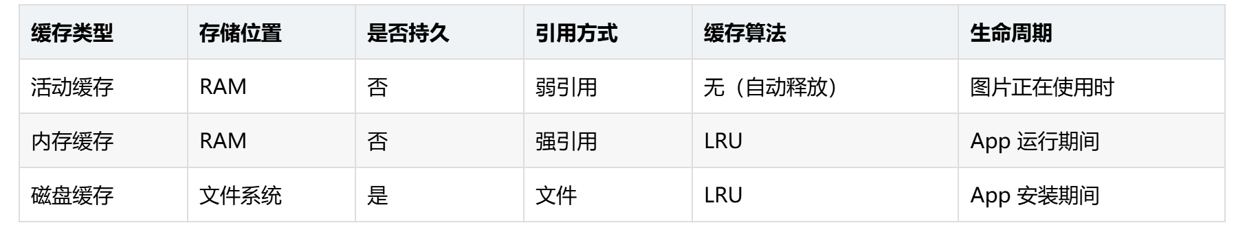 活动缓存:正在显示,防闪烁;内存缓存:闲置图片,提流畅;磁盘缓存:持久化,省流量、支持离线。