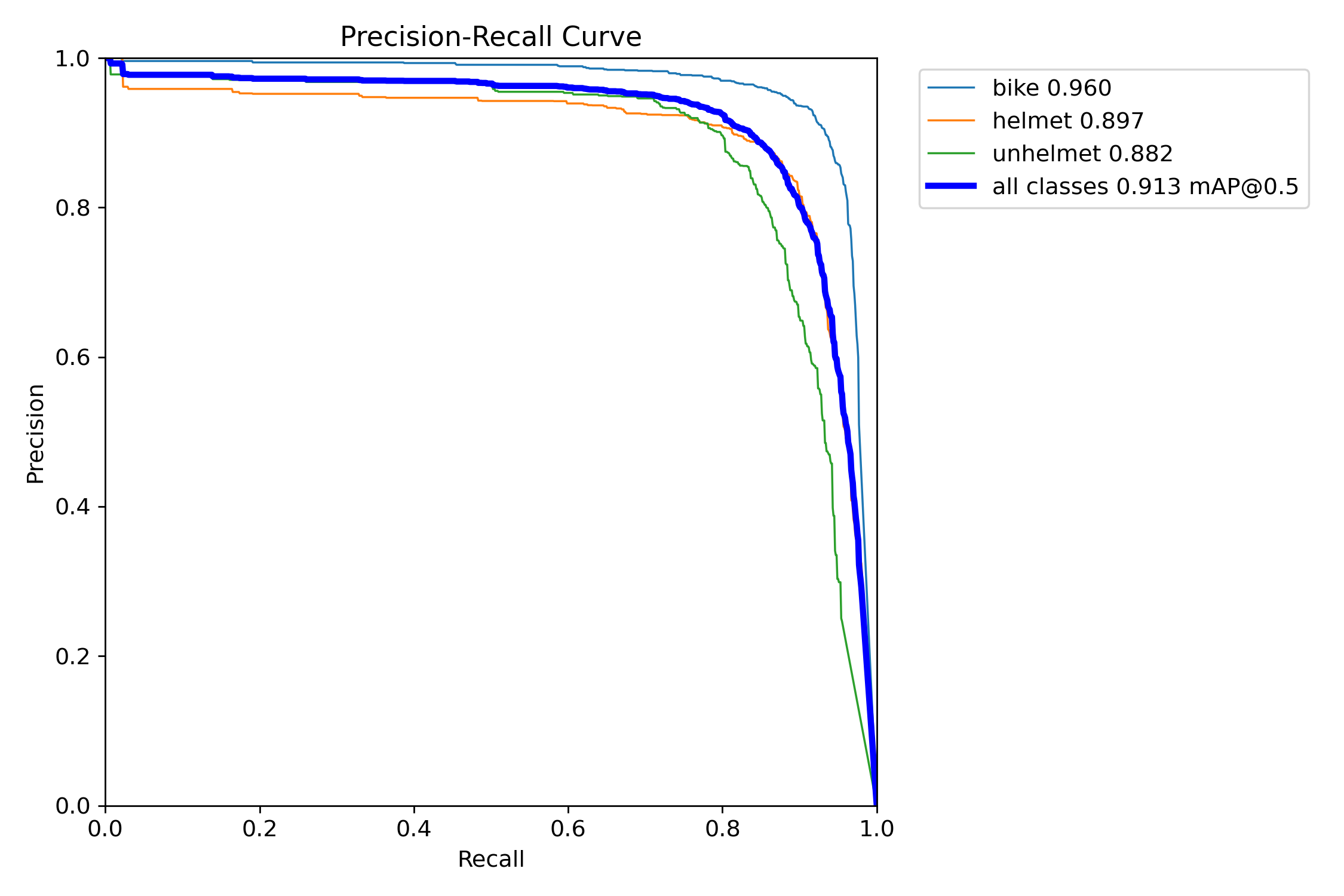 我们通常用PR曲线来体现精确率和召回率的关系,本文训练结果的PR曲线如下。mAP表示Precision和Recall作为两轴作图后围成的面积,m表示平均,@后面的数表示判定iou为正负样本的阈值。mAP@.5:表示阈值大于0.5的平均mAP,可以看到本文模型目标检测的mAP@0.5值为0.913,结果还是不错的。