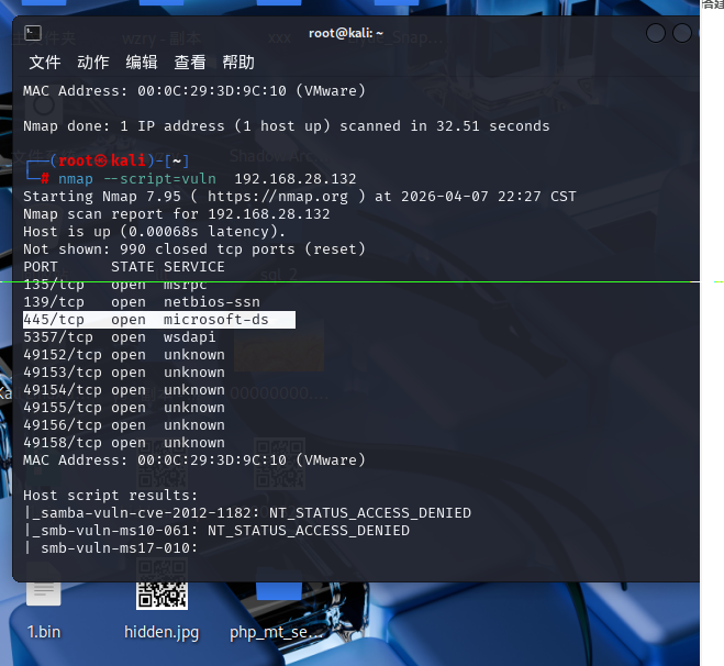 --script=vuln:加载 Nmap 的 "vuln" 脚本组,包含数百个已知漏洞检测脚本(如永恒之蓝、SMB漏洞、弱口令等)看到存在445