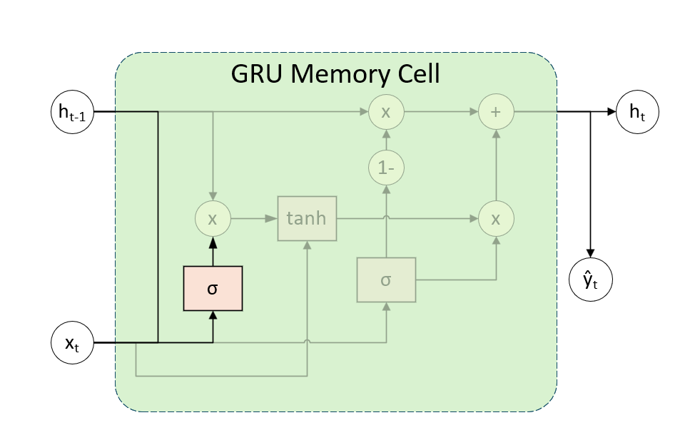 接着,将 LSTM 的遗忘门和输入门合并为更新门(Update Gate),同时控制遗忘和更新,即历史信息与当前输入的融合比例。门控公式与图像如下: