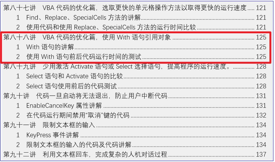 如果大家在学习了我的第一套教程第八十八讲:VBA代码的优化篇,使用With语句引用对象后,上述语句用WITH语句改写,又该如何呢?请大家思考。